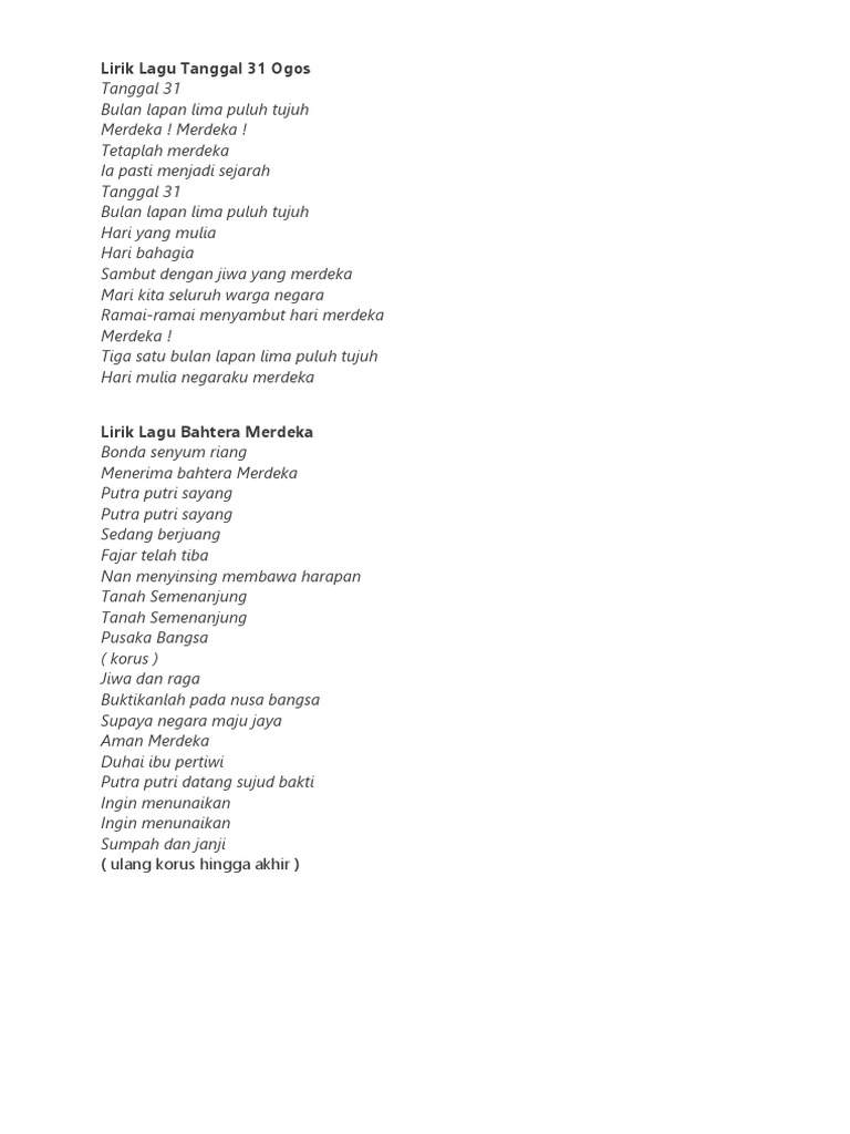Bagi menyemarakkan lagi rasa cinta dan sayang pada negara kita Malaysia kami kumpulkan kepada anda 12 lagu patriotik terbaik beserta lirik. Demi tanah yang bertuah Taman cinta merdeka Kasih di hatiku ini Untukmu tanah pertiwi. Demi tanah yang bertuah.