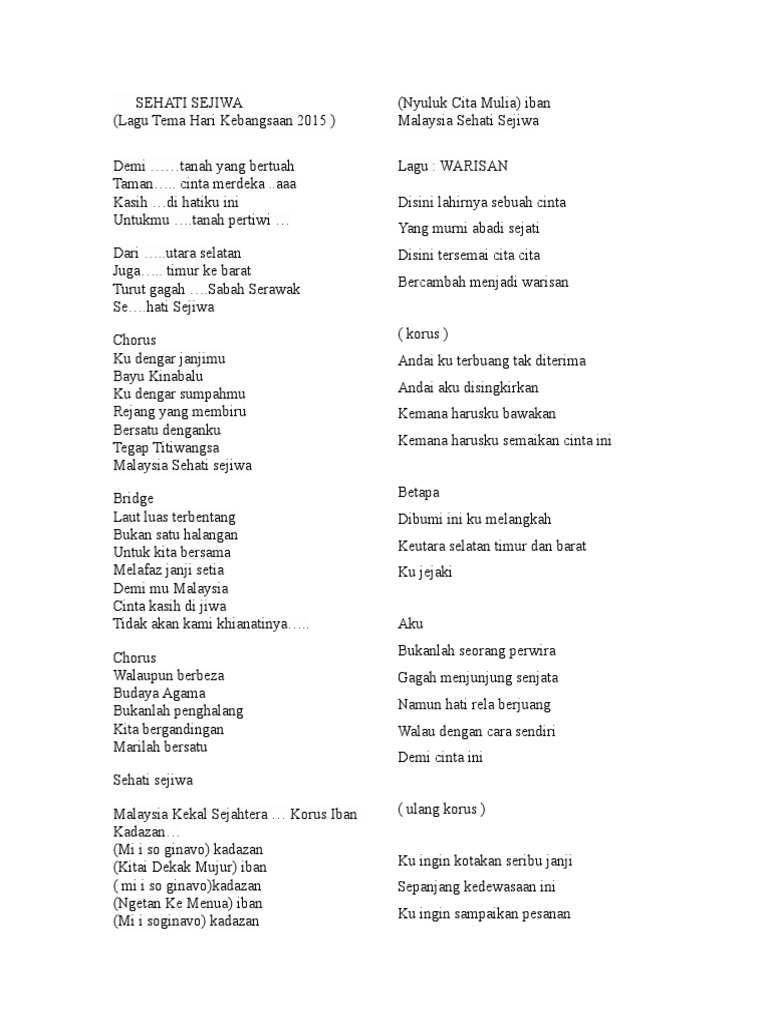 Lirik Lagu Sehati Sejiwa Demitanah yangbertuah Tamancinta merdekaaaa Kasihdi hatikuini Untukmutanah pertiwiiii Dariutara selatan Juga. Lirik laguSuara sekata senadaMesranya semuaLahir cita impianTercapai yang dicarikanMaju bangsa maju negaraAbadi hendaknyaHarumlah nama MalaysiaDi mana sahaj. LAGU SEHATI SEJIWA Add to my workbooks 0.